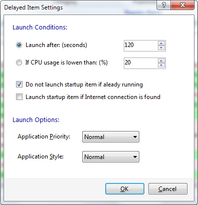 New advanced options have been added to Startup Delayer to enable you to have more control on delayed startup items. For example, you can specify whatever to launch a startup item after a certain amount of seconds or when the CPU usage is lower than a certain value. You can also specify the priority and the style of each delayed startup item.